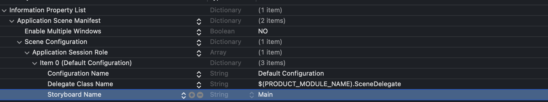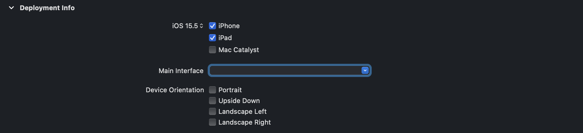 먼저 TARGETS- General - Deployment Info의 Main Interface가 Main으로 되어있는데 지워주자.