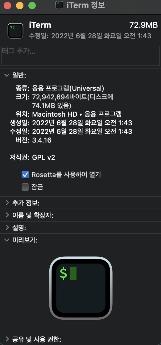 파인더에서 사용하는 터미널을 우클릭 - 정보 가져오기 - Rosetta를 사용하여 열기 체크