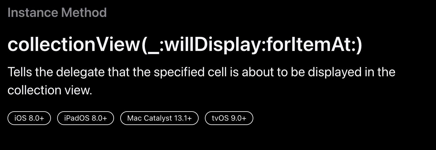 scroll 되기 전에 첫 번째 cell에 애니메이션 효과를 적용해주기 위해 이것저것 찾아보다가 UICollectionViewDelegate 메서드에서 willDisplaycell이라는 메서드를 발견했다.