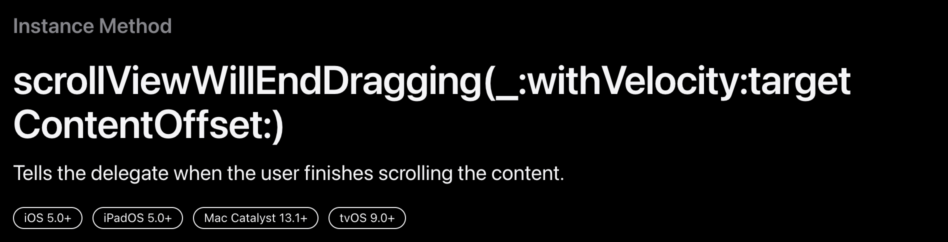 UIScrollViewDelegate의 ScrollViewWillEndDragging 메서드를 이용하자. 이 메서드는 드래그가 끝날 때 호출된다.