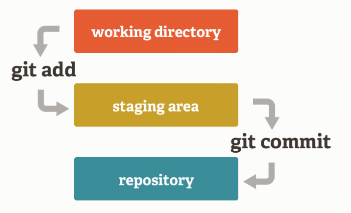 먼저 Working Directory는 프로젝트에서 실제로 작업을 하는 공간이라고 생각하자. 파일을 생성하고 변경하면 먼저 Working directory에서 작업하게 된다. 그리고 Working directory에서 생성하고 변경한 내용을 변경 사항이라고 보자. 이 변경 사항들은 git add 명령어를 통해 Stage Area에 올릴 수 있다. Stage는 커밋하기 전에 변경사항을 등록하는 공간이고 Stage에 올라간 파일들은 staging상태가 된다. Staging 상태의 파일은 git commit 명령을 통해 Git Repository(저장소)에 올라간다.