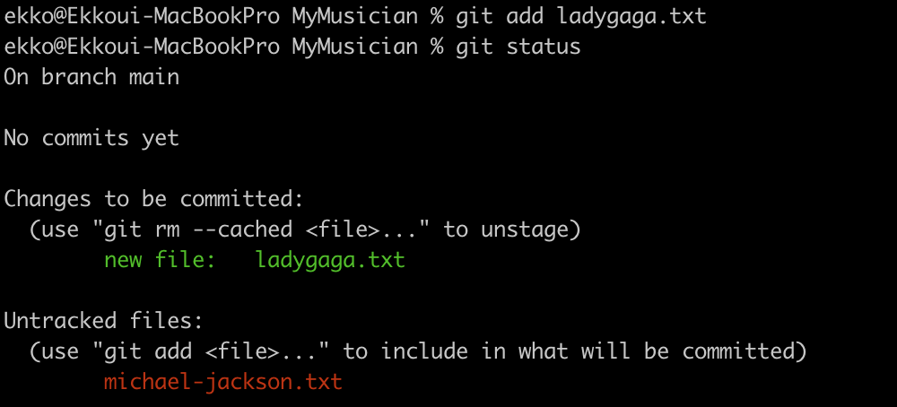 git status로 확인해 보면 위와 같이 나오는데 new file인 ladygaga.txt가 스테이지에 올라갔다는 의미이다. michael-jacson.txt는 아직 올라가지 않았다.
