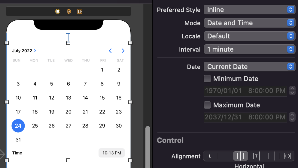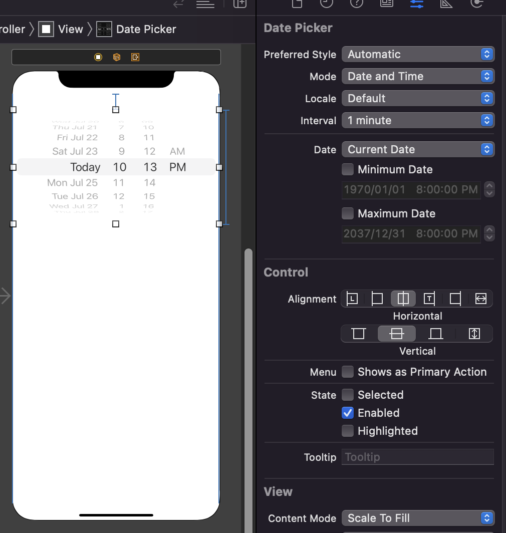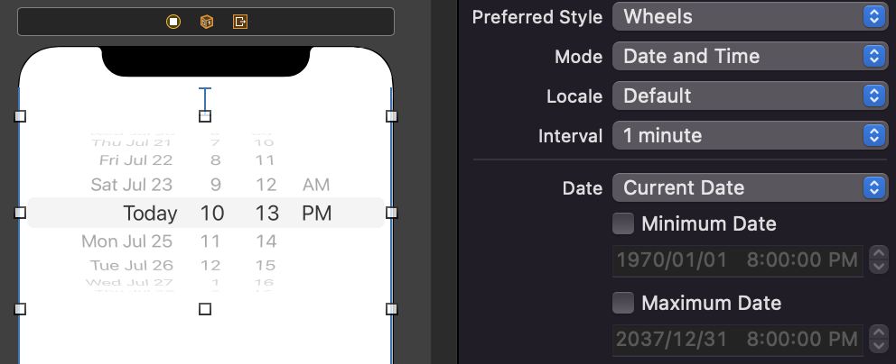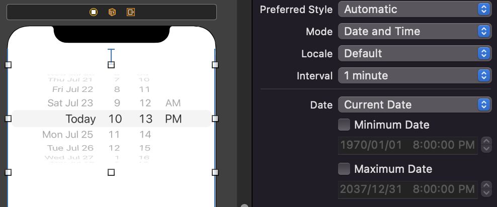Attribute Inspector에 있는 DatePicker의 핵심 Attribute를 살펴보자.
