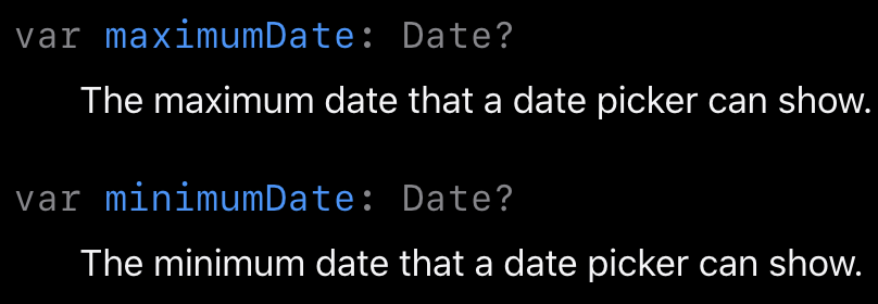 datePicker.date = Date(timeIntervalSinceNow: (60 * 60) * 24 * 1) // ((초 * 분) * 시) * 일